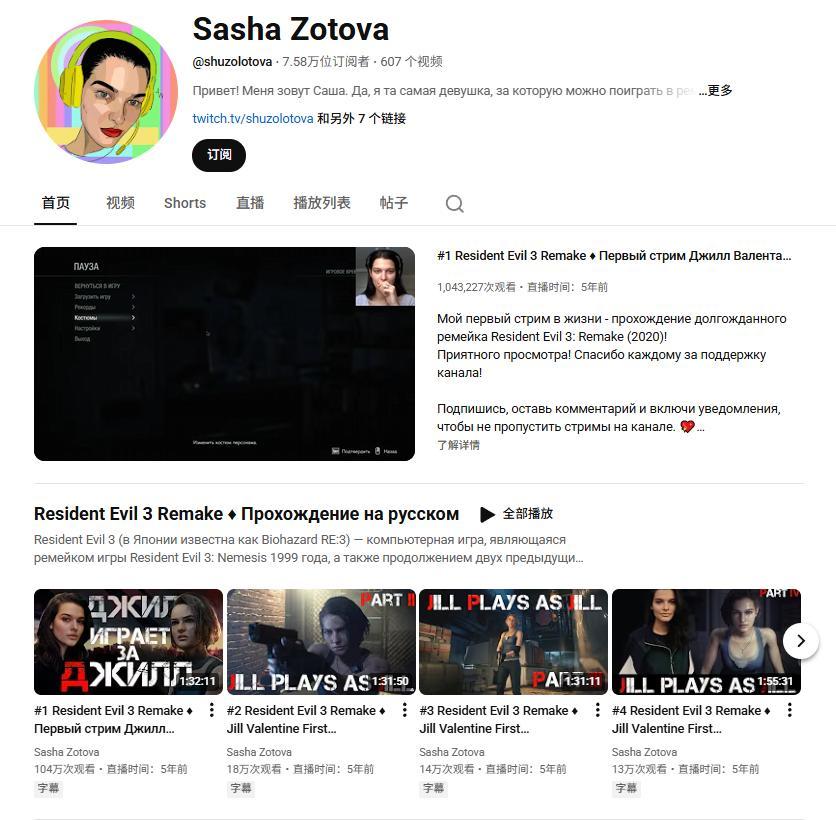 而吉爾的臉模Sasha Zotova更是能稱作一位真正的遊戲玩家,在她的YouTube頻道上就能看到各種各樣的遊戲實況,其中流量最大的也正是她作爲臉模曾出演過的《生化危機3 重製版》。