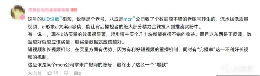 也有人指出具體問題,通過UID位數來判斷該賬號可能是數據不錯的老賬號轉生,而非今年二月冒出來的新人。再根據其流水線化的AI形象、AI文案、AI念稿,以及看上去有些不正常的播放量數據,判斷可能存在一個幕後推手。