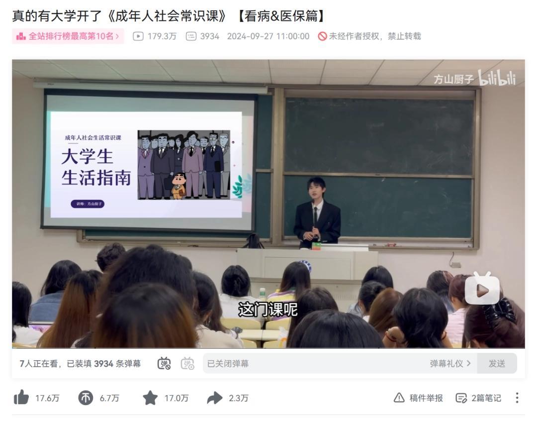 而2024年,南京傳媒學院還開設了一門名爲《大學生生活指南》的公選課,授課人同樣在B站發佈了完整的錄像,包括看病、社保、租房、如何乘坐高鐵飛機等諸多生活常識。值得一提的是,這部視頻還曾登上過全站排行榜第十名,播放量也不俗。