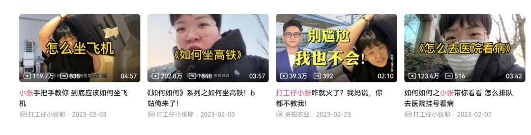 2023年初,UP主“打工仔小張耶”便因“如何乘坐飛機、高鐵”“如何去醫院看病”等視頻爆火,甚至還被央視農業報道過。