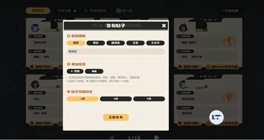 發佈帖子:點擊頁面右上角發佈帖子,選擇精靈、果實、精靈蛋、三小隻等交換主題,依次填寫我想擁有和我能提供的資源(至少填寫一項,每項最多5個關鍵字,可添加情緒價值、組隊帶打等額外價值點),選擇帖子停留時長(1天/3天/5天),確認信息後點擊立即發佈即可。