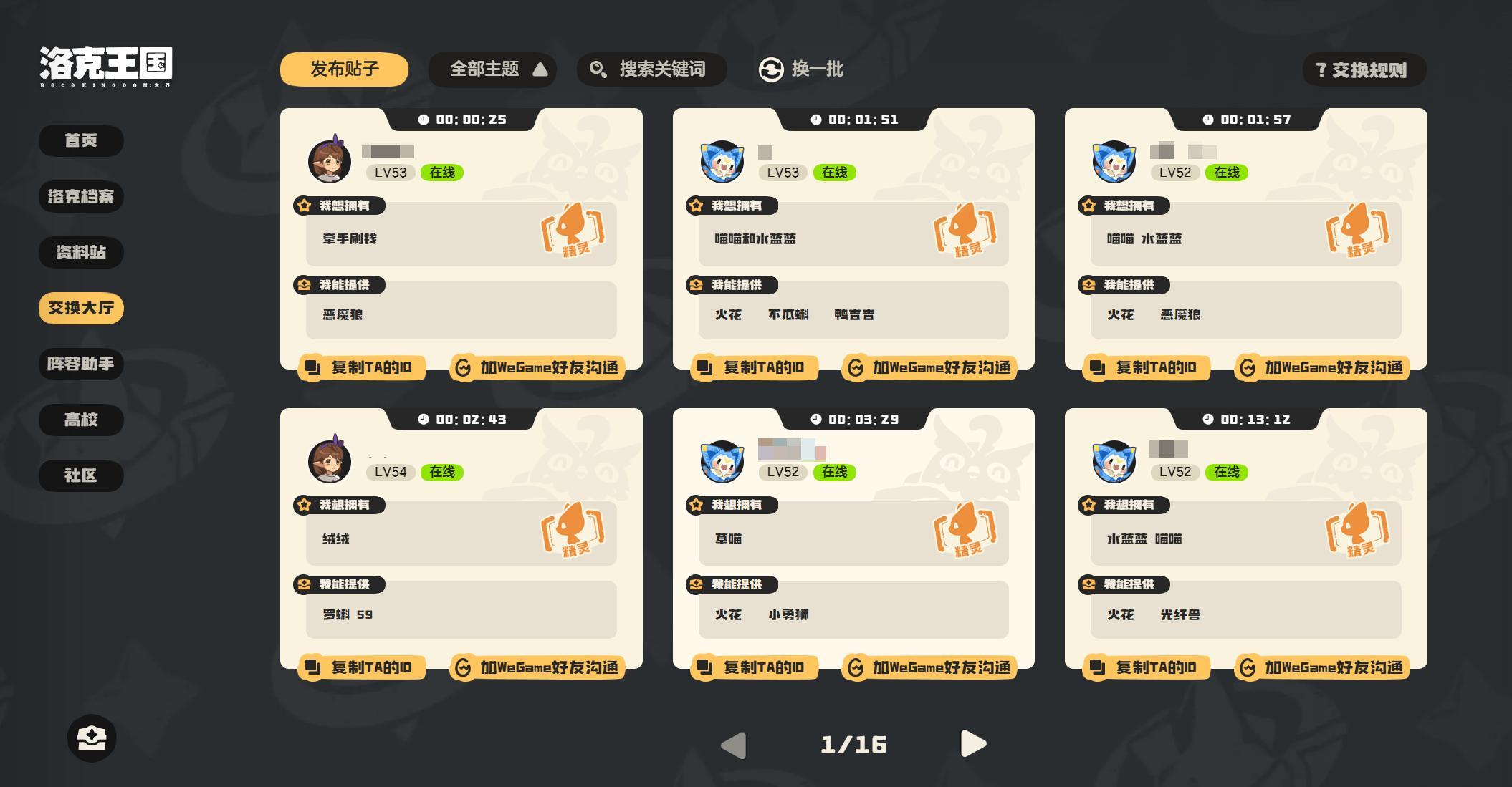瀏覽帖子:在交換大廳首頁可直接瀏覽所有玩家發佈的交換信息,也可通過頂部搜索關鍵詞、切換主題分類,精準找到符合自己需求的交換帖子,頁面還會實時展示玩家在線狀態,優先匹配在線玩家,提升交換效率。