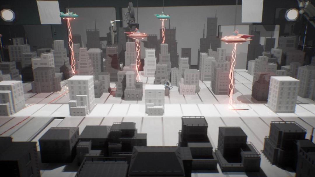 這是一種非常獨特的體驗。一方面,是完全建立在橫向X軸上的玩家行爲:達爾文只能依附看不見的2D直線行動;但另一方面,背景中的遊戲世界卻在依照3D邏輯運轉:在你的身後,是戒備森嚴的外星人大軍、來往匆匆的車流,以及逐漸崩塌的城市。