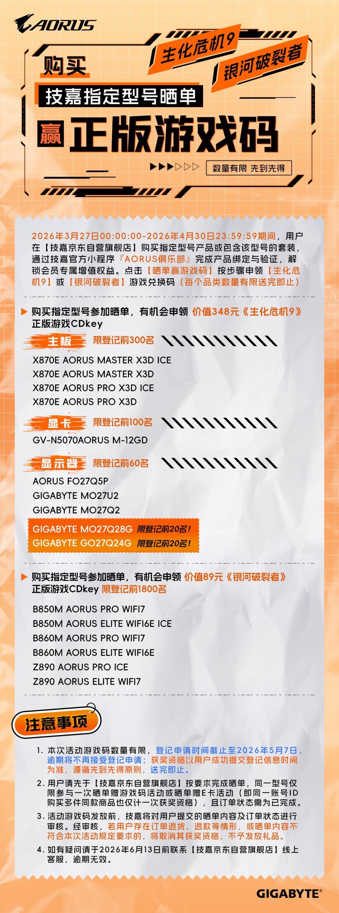 更有驚喜限時活動等你來參與!在2026年3月27日00:00至4月30日23:59期間,凡在【技嘉京東自營旗艦店】購買指定型號產品或對應套裝,通過技嘉官方小程序「AORUS俱樂部」完成產品綁定與驗證,即可解鎖會員專屬增值權益。按照指引點擊【曬單贏遊戲碼】完成申領,即可獲得《生化危機9》或《銀河破裂者》遊戲兌換碼!數量有限,先到先得