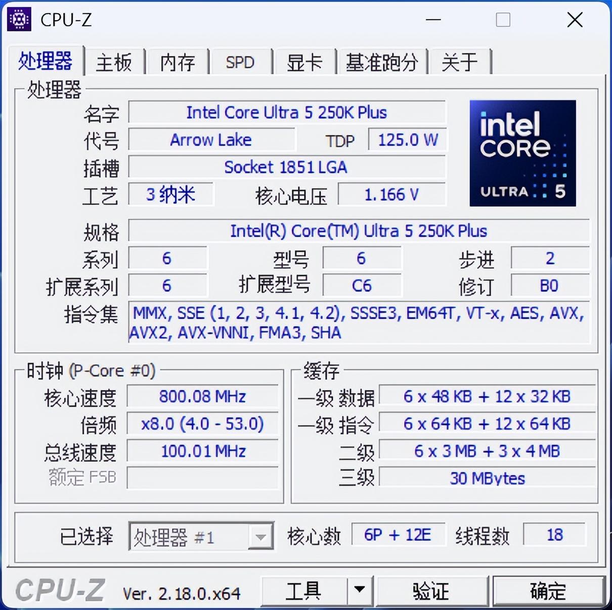 這款處理器基於英特爾新一代的Arrow Lake Refresh架構打造,相較老款Ultra 5 245K增加了4個E核,也就是現在總共擁有6個P核和12個E核,總計18核18線程。緩存方面升級後擁有了30MB的L3緩存和30MB的L2緩存,分別相較Ultra 5 245K增加了6MB和4MB。與此同時,在維持基礎功耗和最大睿頻功耗不變的前提下,Ultra 5 250K Plus相較Ultra 5 245K,增加了100Mhz的性能核頻率,P核最大睿頻5.3GHz,E核最大睿頻4.6GHz。