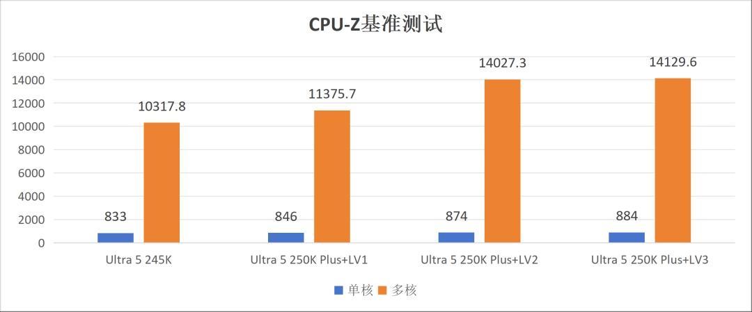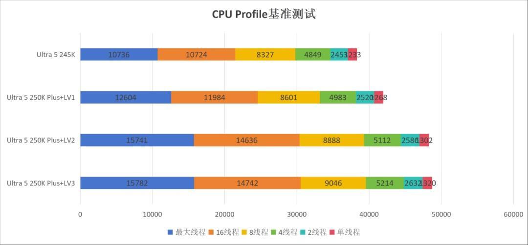 而在3D Mark的CPU Profile測試中,Ultra 5 250K Plus的最大線程得分對比Ultra 5 245K,最大能達到誇張的47%,即便是縮減到8線程和最小的單線程得分,領先幅度也能平均達到7.6%。此時的成績基本與上一代Ultra 7 265K不相上下了。
