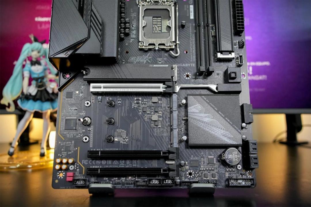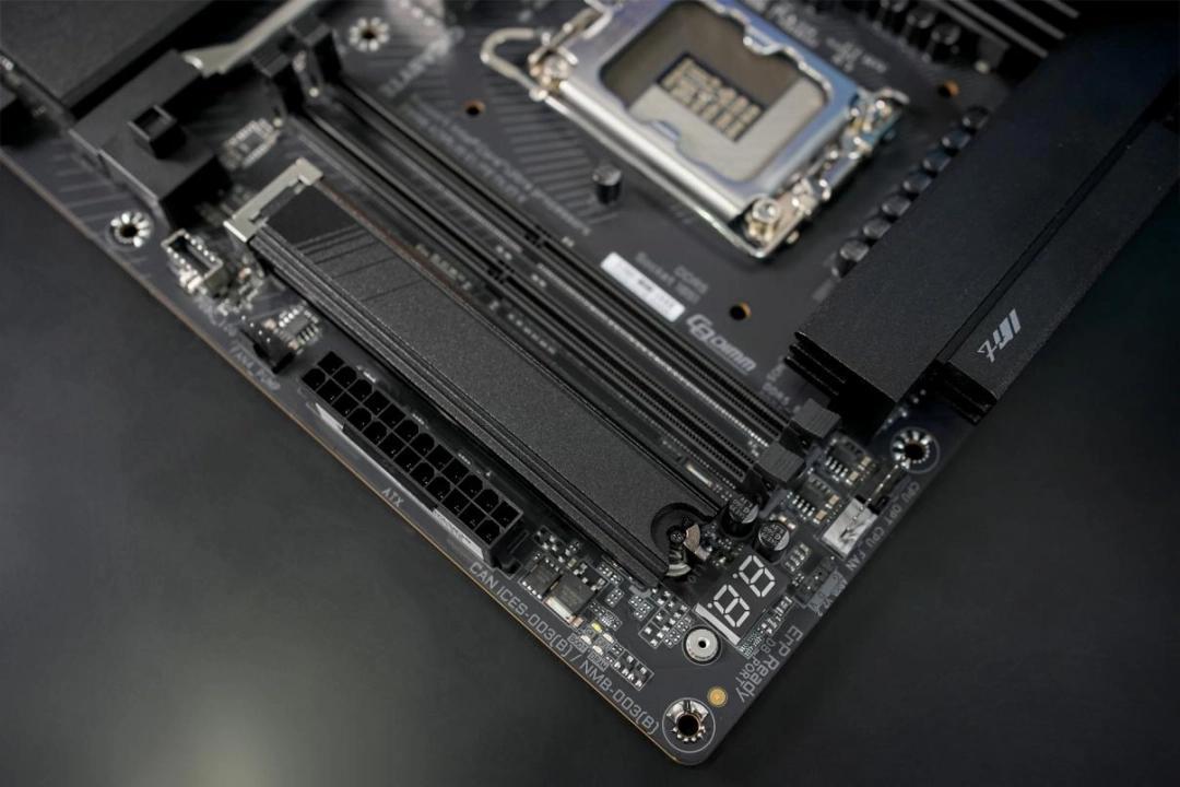 CPU插槽右邊是兩條支持雙通的DDR5內存插槽,兼容CUDIMM / CQDIMM內存,配合技嘉面向DDR5的新一代智能AI超頻技術——D5 DUO X,憑藉四大突破性技術——CQ-DIMM架構升級、2-DIMM拓撲結構增強、PCB電路優化。以及BIOS調校技術,僅用2根內存插槽即可實現傳統4插槽的最大容量,同時釋放超頻潛力,可將全新標準類型的DDR5內存超頻至最高10266MT/s的頻率。