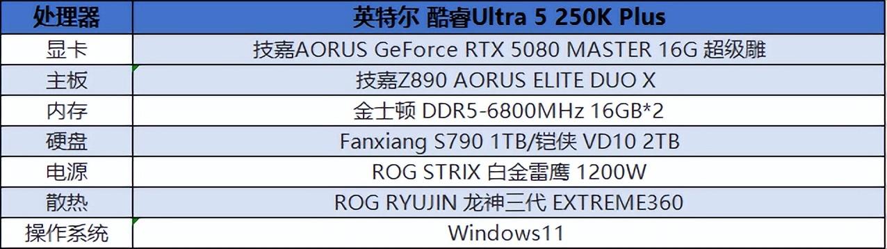 所謂好馬配好鞍,這次爲了充分釋放這塊Ultra 5 250K Plus處理器的性能,我們也爲它選配了一套相當強悍的配置。主板採用了技嘉最新推出的Z890 AORUS ELITE DUO X小雕,它配備了多項專爲英特爾 酷睿Ultra 200S系列處理器打造的尖端技術,可以充分釋放處理器的隱藏性能,顯卡也是來自技嘉的AORUS GeForce RTX 5080 MASTER 16G超級雕(黑色),內存則是金士頓的兩條16GB DDR5 -6800Mhz,其餘詳細配置如下表所示。