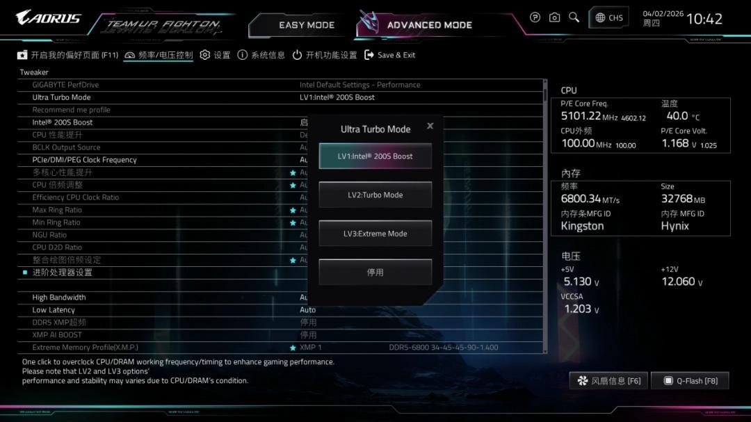 技嘉這次也給主板的BIOS界面進行了升級,更加簡約美觀酷炫的同時,交互體驗也迎來升級。支持一鍵截圖和一鍵直達BIOS路徑,還可以實時顯示CPU/系統/VRM溫度。當然,其中最重要的就是這次技嘉爲英特爾 酷睿Ultra 200S Plus系列處理器帶來了全新的Ultra Turbo模式,可一鍵解鎖處理器隱藏性能。它包含了三個檔位的性能提升,LV1爲默認開啓的Intel 200S Boost,LV2爲優化核心曲線與內存加速從而提升遊戲幀率的Turbo Mode,最強力的LV3 Extreme Mode則是極致的激進調校,全面釋放處理器隱藏性能,專爲電競遊戲而生。具體三種模式能在日常遊戲體驗和生產力工作中帶來多大的性能提升,後面我們會在具體測試中爲大家解答。