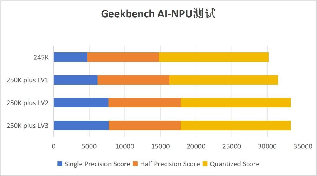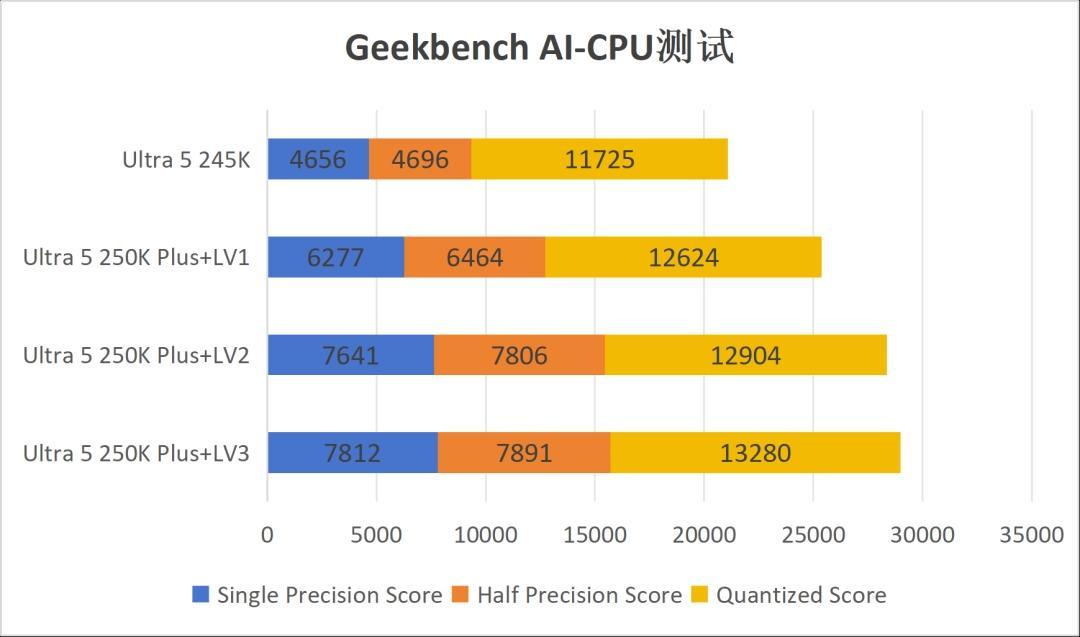 除此之外,考慮到AI PC是近兩年的行業熱門,我們也測試了這對處理器主板組合在Geekbench AI中的表現。在軟件的CPU測試中,Ultra 5 250K Plus的提升依舊顯著,即便只用主板默認的LV1擋位,平均也比Ultra 5 245K提升了26.7%,切換到Extreme Mode後,提升最小的Quantized Score,也能取得13.2%的漲幅。