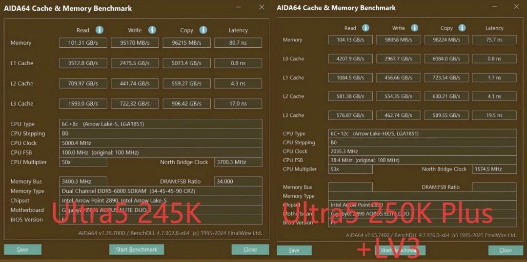 至於大家更關注的,Ultra 5 250K Plus在升級了內部總線以及內存控制器後,日常使用時內存訪問延遲的問題,我們也專門做了測試。通過AIDA64的測試結果可以看到,在使用同一對未超頻的DDR5-6800MHz內存時,Ultra 5 250K Plus的延遲表現確實要比Ultra 5 245K好上許多,尤其是開啓了主板Ultra Turbo模式的Extreme Mode擋位後,延遲整體可以下降7%,同時內存的讀取也寫入速度也得到顯著提升。