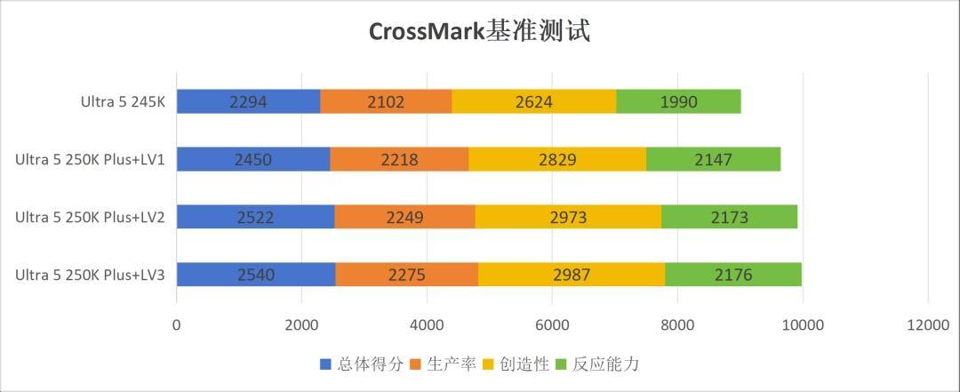 具體到日常生產力的測試上,我們用兩款處理器分別跑了CrossMark的基準測試,Ultra 5 250K Plus依舊是全面超越了Ultra 5 245K,各類測試項目平均領先7%,開啓Extreme Mode後,平均領先幅度進一步來到10.5%。