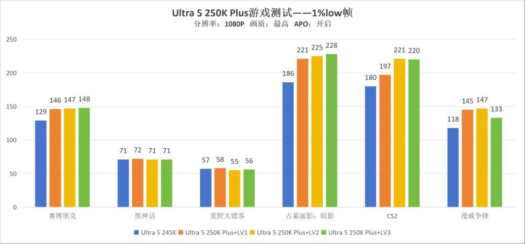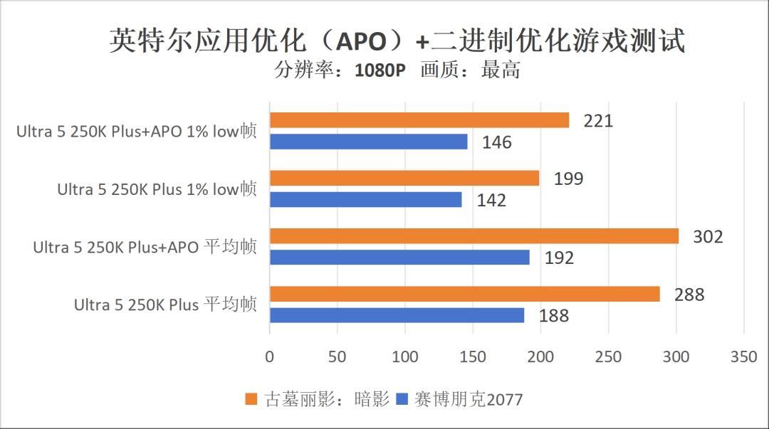 考慮到前面提了英特爾的應用優化技術(APO)和二進制優化技術對遊戲幀數亦有所提升,所以我們先測試二者在兩款已經獲得提升的遊戲——《賽博朋克2077》和《古墓麗影:暗影》中的表現。在使用Ultra 5 250K Plus處理器並默認開啓Intel 200S Boost的狀態下,可以看到開啓應用優化技術(APO)和二進制優化技術後,兩款遊戲的平均幀和1%low幀均有所提升,在《賽博朋克2077》中,二者的提升分別爲2.1%和2.8%,到了配置要求更親民的《古墓麗影:暗影》中,提升能被拉大到4.8%和11%,雖沒有英特爾官方宣傳的平均8%那麼誇張,但考慮到這項技術目前適配的遊戲並不算多,且英特爾目前也在與更多遊戲廠商接觸和推廣該技術,未來它的成果肯定會是值得期待的。
