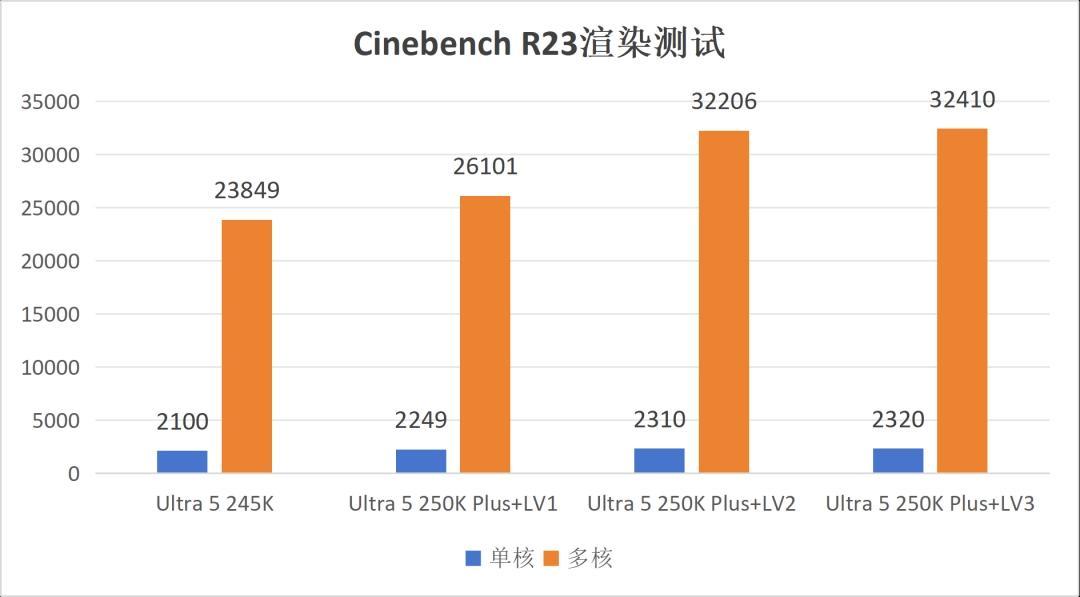 首先是基礎跑分環節。在Cinebench R23測試中,開啓主板Ultra Turbo模式默認LV1擋位的Ultra 5 250K Plus取得了單核2249,多核26101的成績,相較前輩Ultra 5 245K分別提升7%和9.4%,提升到最高性能的LV3後,差距能進一步拉大到10.4%和35.8%。