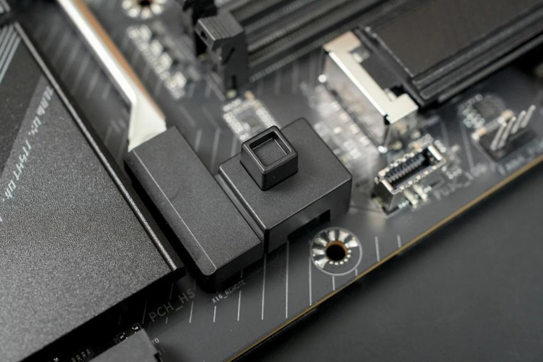 顯卡插槽爲全尺寸PCIe5.0 x16,不光有金屬裝甲加固提供可靠的穩定性,邊上還能看到它採用了物理連桿與快拆按鈕連接,只需按下按鈕即可彈開插槽的物理撥片從而輕鬆取下顯卡,大幅提升了裝機的便利性。