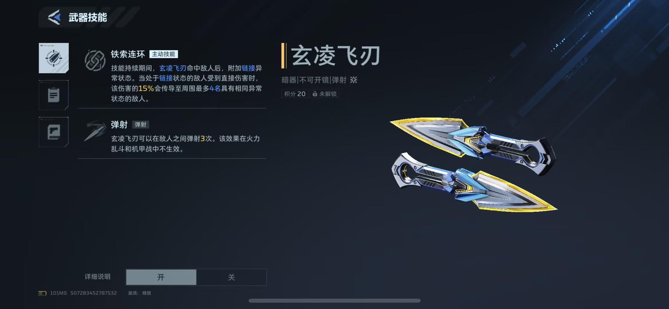遊戲首款暗器類主武器玄凌飛刃則打破了傳統的射擊邏輯,以投擲和彈射爲核心機制,投擲後傷害可以在多個敵人之間彈射。
