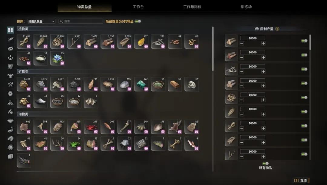 比如說物資總量系統可以直觀地看到家裏所有的材料,還能直接統籌物資生產,給部分材料設限,防止過度生產導致存儲爆倉。