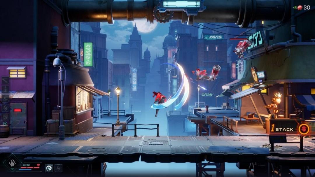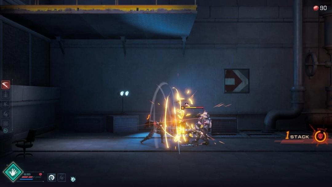 所以,《SlashZero》雖然是一款主打高速的華麗動作遊戲,但當你面對那些無法一擊必殺的敵人,還想要一口氣壓制到底時,如連打攻擊鍵去反應信號燈的最後一幀等極限操作,在這裏大概是行不通的。多數時候,玩家都需要主動選擇放幀,或是乾脆中斷當前正在進行的連段,避免被冗長的HIT模組擠佔掉完美招架、衝刺、必殺技等指令的輸入時機。