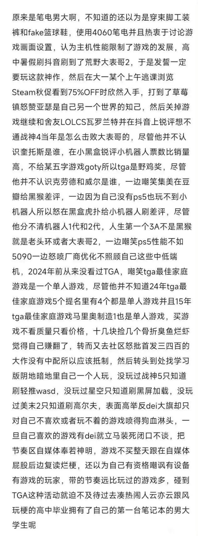 以上這些核心要素,再加上一點點過剩的表達欲、良好的自我感覺,以及幾句渴望標榜自己和那些打粥、打和平的舍友不同,卻適得其反的裝逼爆典言論,一個典型的“筆電男大”形象就躍然紙上了。