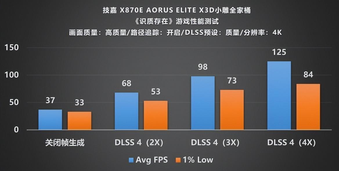 先來看這臺技嘉X870E AORUS ELITE X3D小雕全家桶在4K分辨率下的幀率表現。在純路徑追蹤模式、且未開啓幀生成時,遊戲幀率僅在37幀左右徘徊,運行起來明顯喫力,足以看出路徑追蹤對顯卡帶來的極致性能壓榨。而在開啓DLSS 4多幀生成後,幀率直接迎來爆發式飛躍,4× 檔位下更是一路飆升至絲滑流暢的 125 幀,體驗瞬間煥然一新。