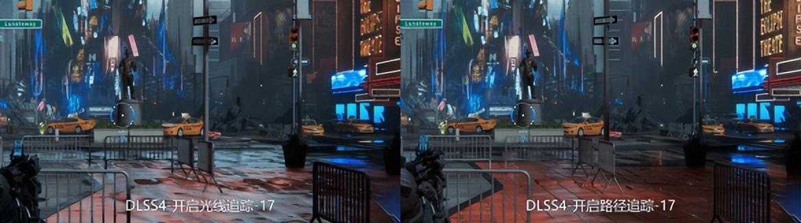 開啓完整路徑追蹤後,整個遊戲世界的光影質感直接躍升至次世代水準:街頭霓虹不再是單調的發光貼圖,而是呈現出自然柔和的光源擴散與色彩溢散;行駛車輛的車身反光隨環境實時變化,巨型電子屏的光線會在周圍物體上形成真實的光照浸染,地面積水對街景、燈光與樓宇的反射完全遵循物理規律,層次細膩、倒影清澈,真實感拉滿。