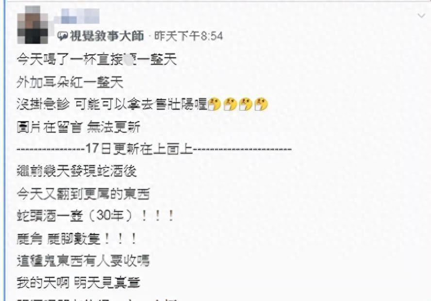 我國臺灣,一名男子在清理租來的舊店鋪時,發現了一罈浸泡了30年的蛇酒。