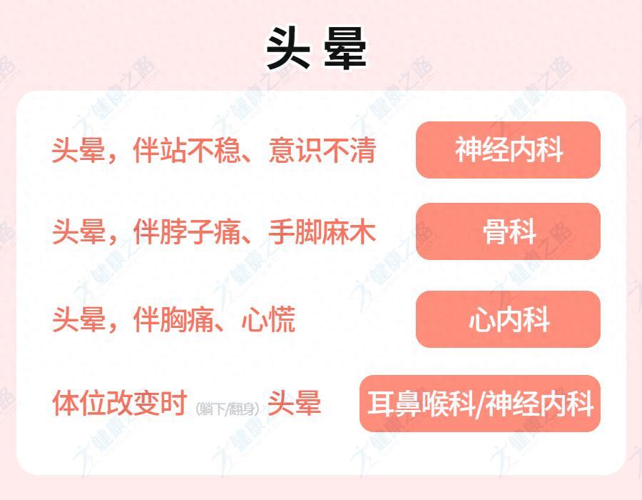 分別是頭暈、頭痛、發燒、脖子痛和肚子痛這5種,許多疾病都會有相關症狀,但由於其他伴隨症狀不同,就診科室也不同: