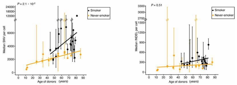 爲摸清吸菸與肺部突變的關聯,研究團隊先對33名不同吸菸史、不同年齡的參與者進行了對比觀察,研究對象涵蓋11歲的不吸菸者,到煙齡數十年、吸菸量每年達116包的重度老煙槍。