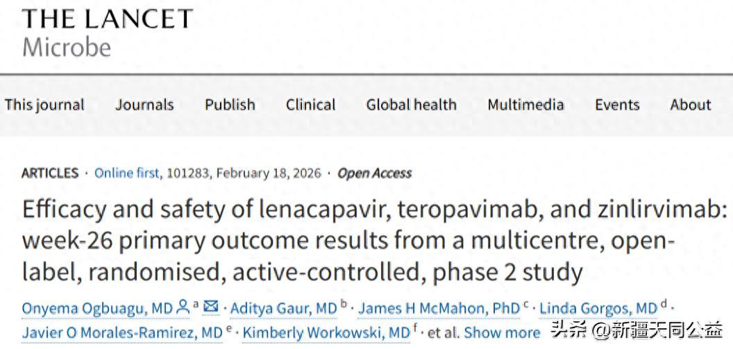 參考資料 Onyema Ogbuagu, Aditya Gaur, James H McMahon, et al. Efficacy and safety of lenacapavir, teropavimab, and zinlirvimab: week-26 primary outcome results from a multicentre, open-label, randomised, active-controlled, phase 2 study. The Lancet Microbe. Published February 18, 2026. DOI: