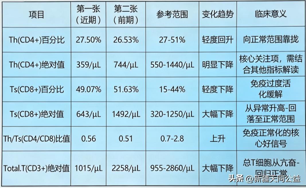 CD4 的 “假性升高” 消失:前期總 T 細胞高達 2258/μL(接近正常上限),是免疫過度活化的狀態,此時 CD4 絕對值 744 是 “被炎症推高的虛高數值”;當總 T 細胞回落到 1015/μL(正常下限附近),CD4 絕對值 359 纔是身體真實的免疫水平。