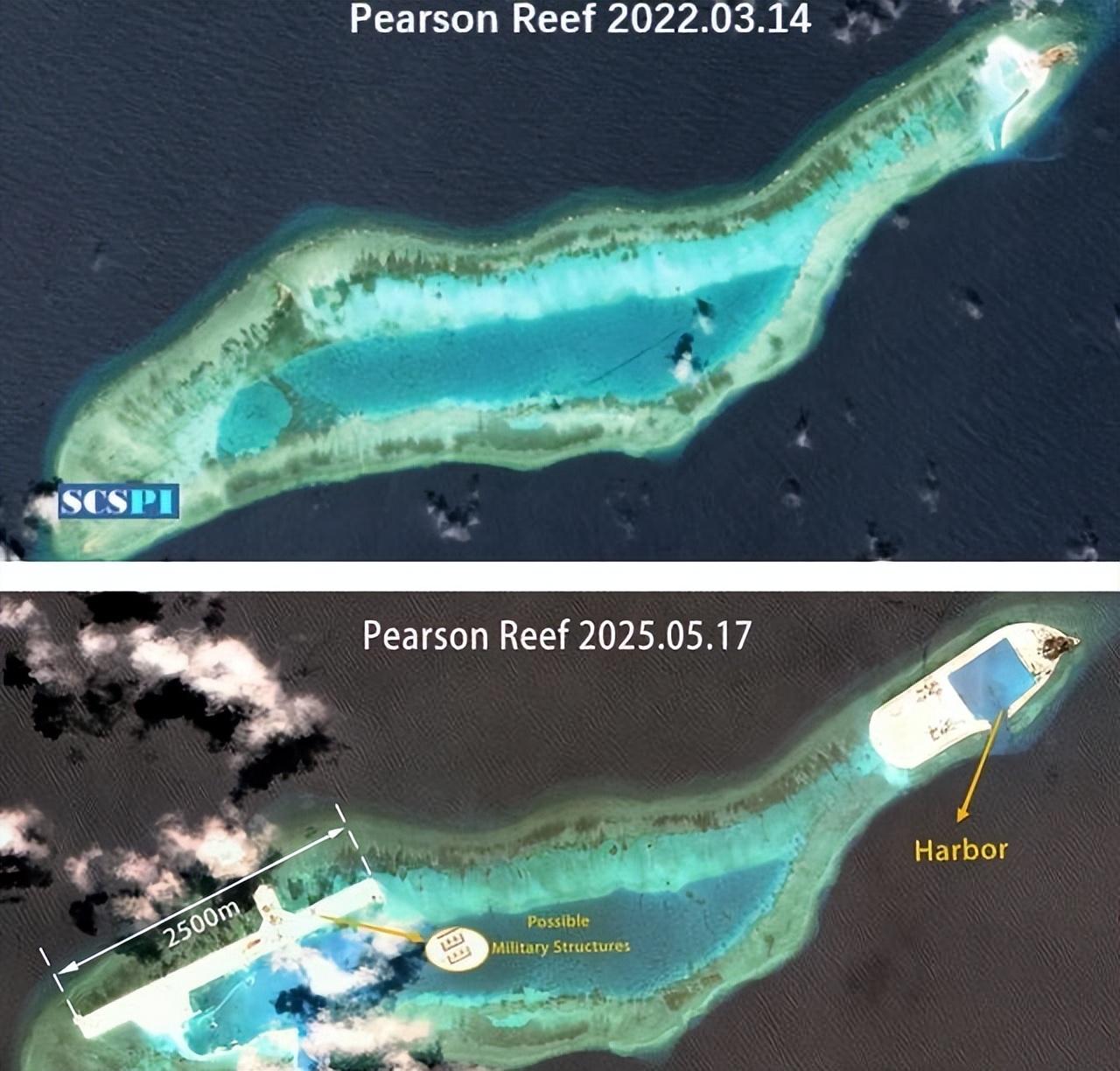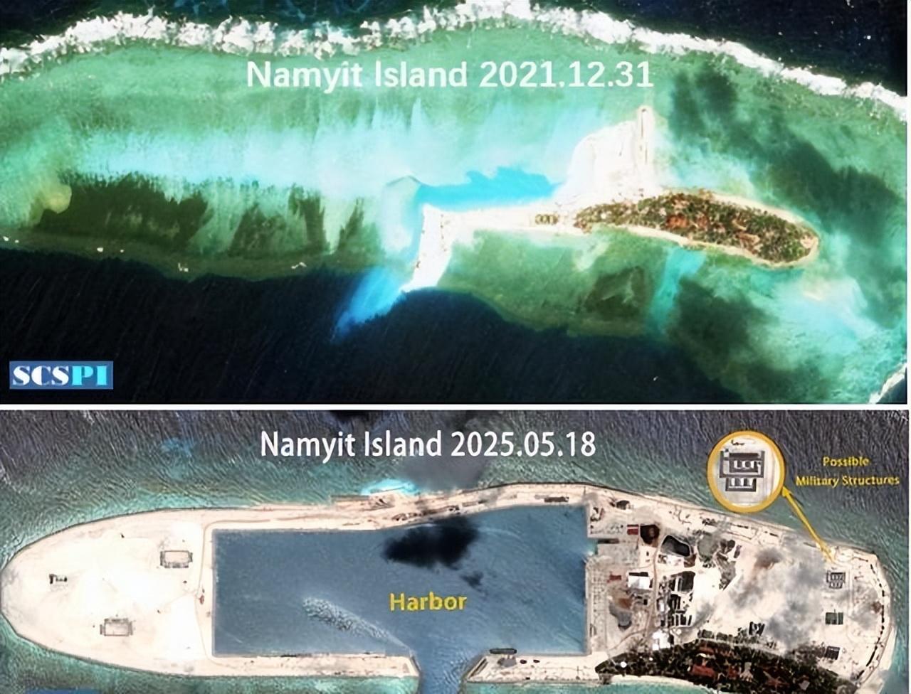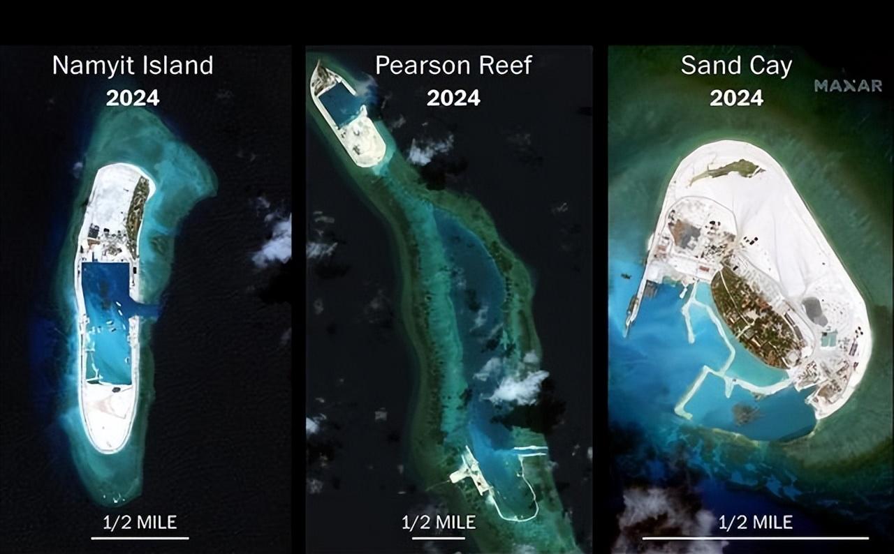 衛星圖顯示,他們在斯普拉特利羣島的艾里森礁、科林斯礁這些地方,從原來小混凝土碉堡升級成軍事前哨,添了港口、建築和防禦設施。