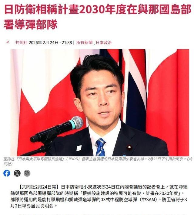 日本那邊反應也快。防衛大臣小泉進次郎同一天在記者會上講清楚。計劃在2030財年把防空導彈部隊放到與那國島。財年到2031年3月結束。島上用的是03式中程地對空導彈。能攔飛機和中低空目標。