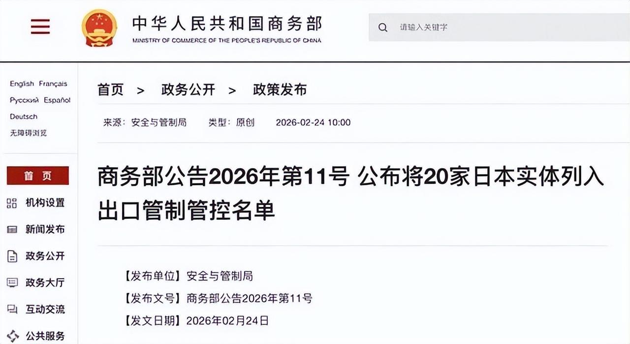 這次中日之間的動靜來得突然。2月24日這一天,兩邊幾乎同時出手。中國商務部先發公告,把20家日本實體列進出口管制名單。這些企業多跟軍工沾邊,涉及造船和航空領域。