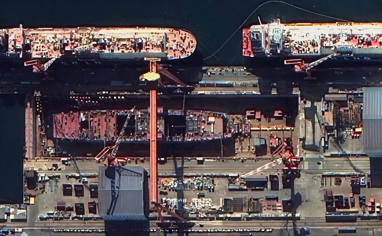 網傳的新衛星圖像顯示,004型核航母的水下部分已經接近完成,最後一部分艦尾模塊入塢,甲板下方的機庫與核反應堆的屏蔽罩均安裝完畢,並且開始了第一塊飛行甲板的吊裝工作。