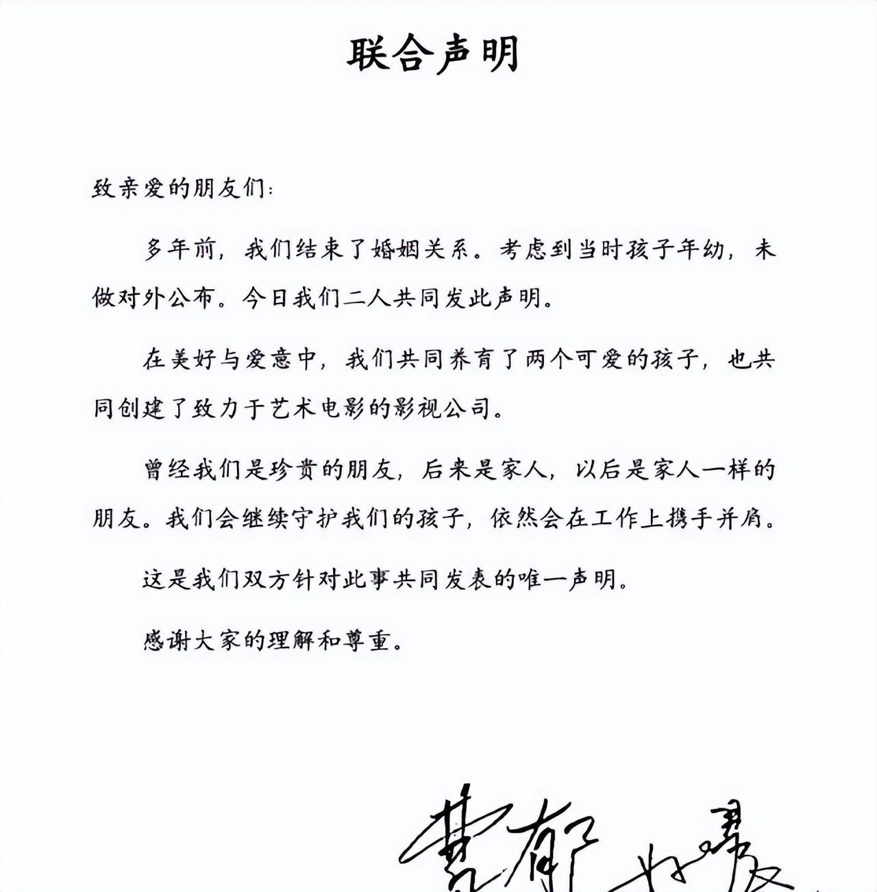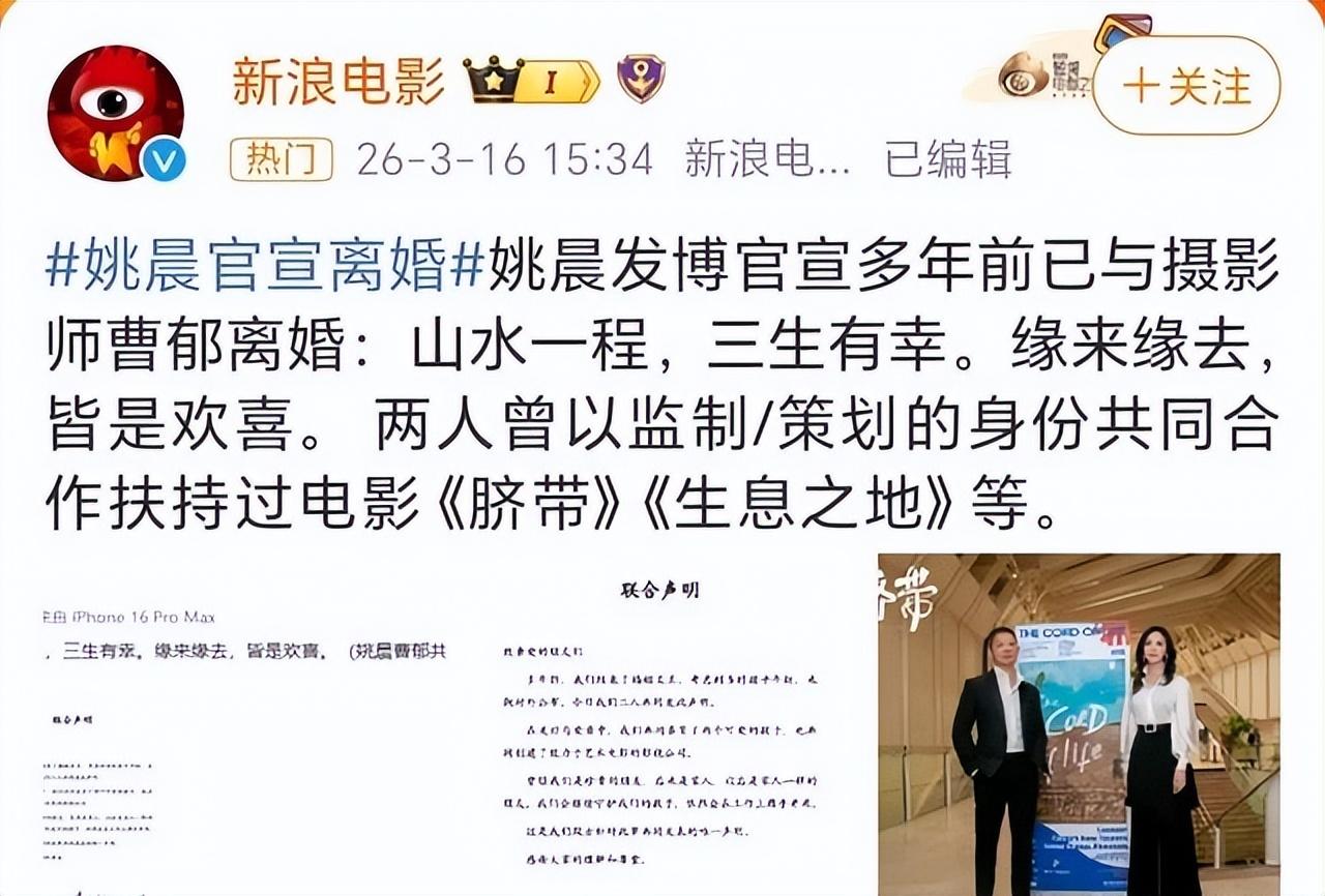 2026年3月16日,姚晨與曹鬱通過各自社交平臺同步發佈聯合聲明,正式對外確認雙方婚姻關係已在多年前結束。當時選擇暫不公佈,主要出於對家庭成員特別是孩子的保護考慮。聲明中明確指出,兩人曾經是珍貴的朋友,後來成爲家人,今後將繼續以家人一樣的朋友身份相處。他們會共同守護孩子,並在工作上繼續合作。這是雙方針對此事發布的唯一正式回應,同時請求外界給予理解與尊重。