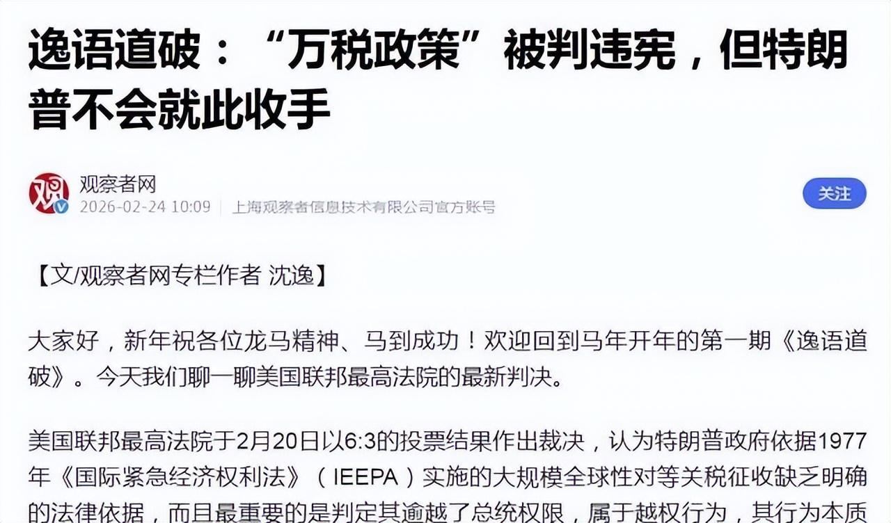 先說關稅這塊。美國最高法院2月20日公佈裁決,認定美國國際緊急經濟權力法沒有授權總統徵收大規模關稅。說白了,特朗普過去一年多的關稅大棒,被自家的最高法院判了個"違法"。這個裁決的影響有多大?據估算,超過1750億美元的關稅收入面臨退款風險。特朗普打了兩年關稅戰,結果被最高法院從根上給否了,臉打得可不輕。