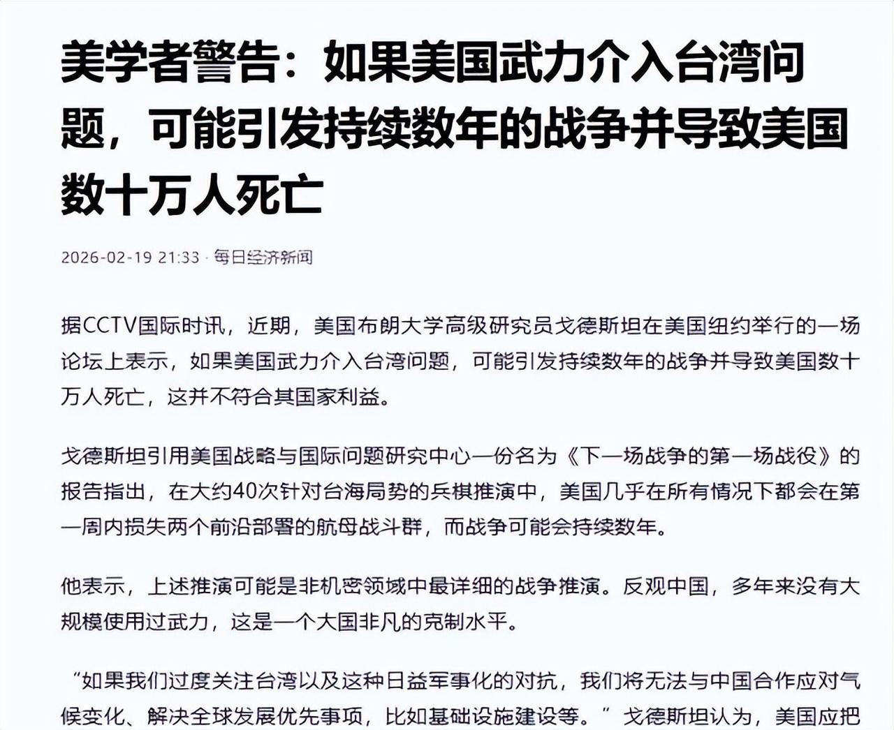 即便從美國自己的討論來看,武力介入臺灣問題的代價也是美方自己承受不起的。美國布朗大學高級研究員戈德斯坦在紐約一場論壇上直言,如果美國武力介入臺灣問題,可能引發持續數年的戰爭並導致美國數十萬人死亡,這並不符合其國家利益。他還援引美國戰略與國際問題研究中心的兵棋推演報告指出,在大約40次針對臺海局勢的推演中,美國幾乎在所有情況下都會在第一週內損失兩個前沿部署的航母戰鬥羣,而戰爭可能會持續數年。