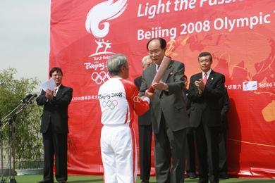 金永南將火炬交給第一棒火炬手。