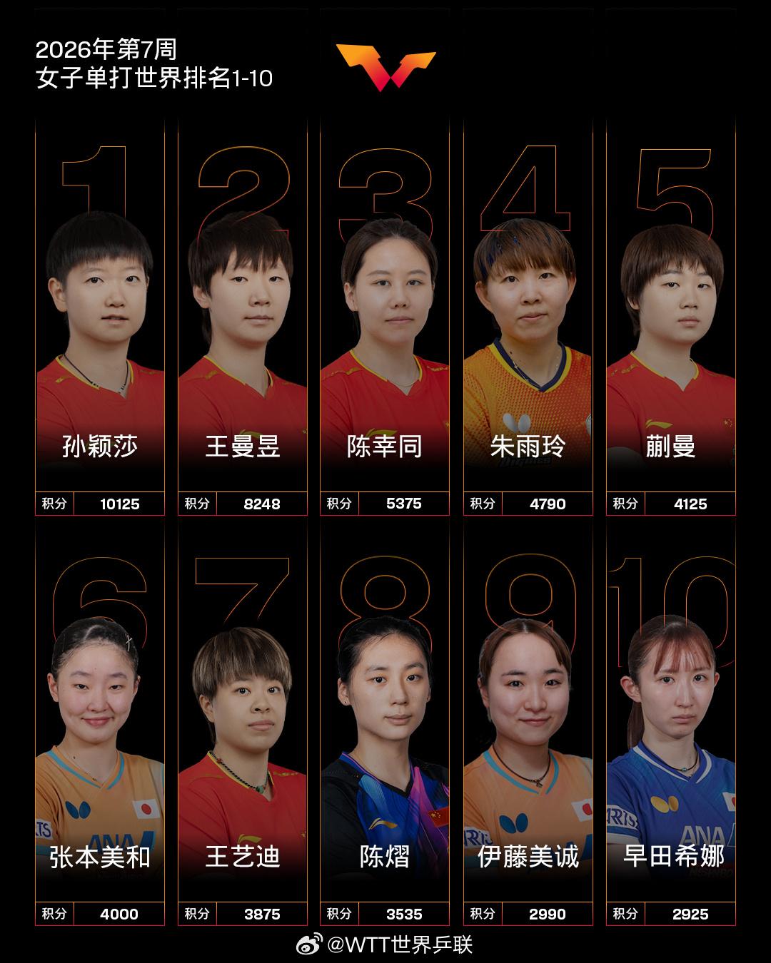 女子單打,中國隊球員孫穎莎、王曼昱、陳幸同位列前三,蒯曼位列前五,王藝迪位列第七,陳熠位列第八。