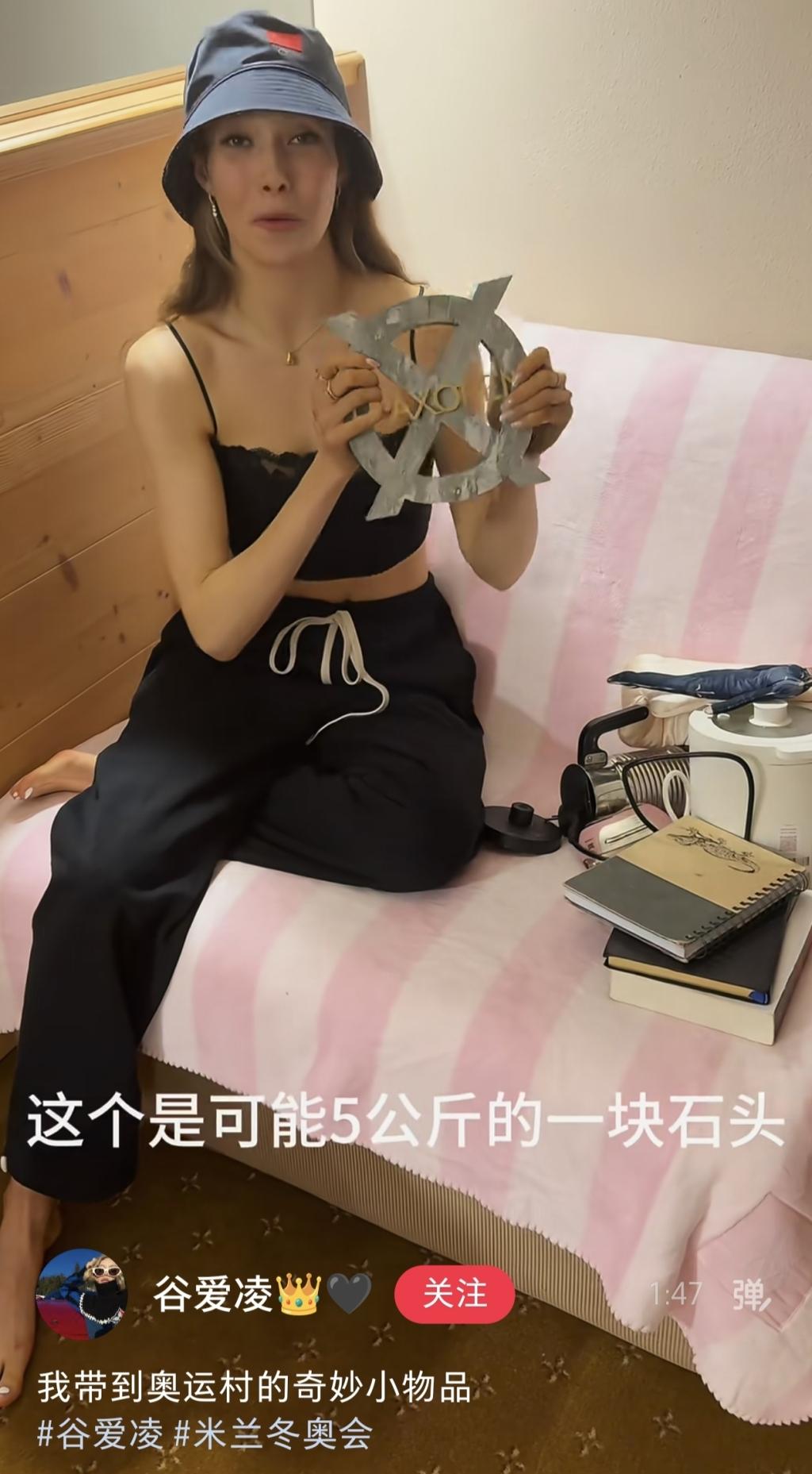 2月5日,谷愛凌在社交平臺分享帶到奧運村的奇妙小物品。其中,有一塊5公斤重的石頭,這是谷愛凌在今年1月的瑞士萊克斯世界盃上得到的冠軍獎盃,因爲沒有時間回家就一直帶着。