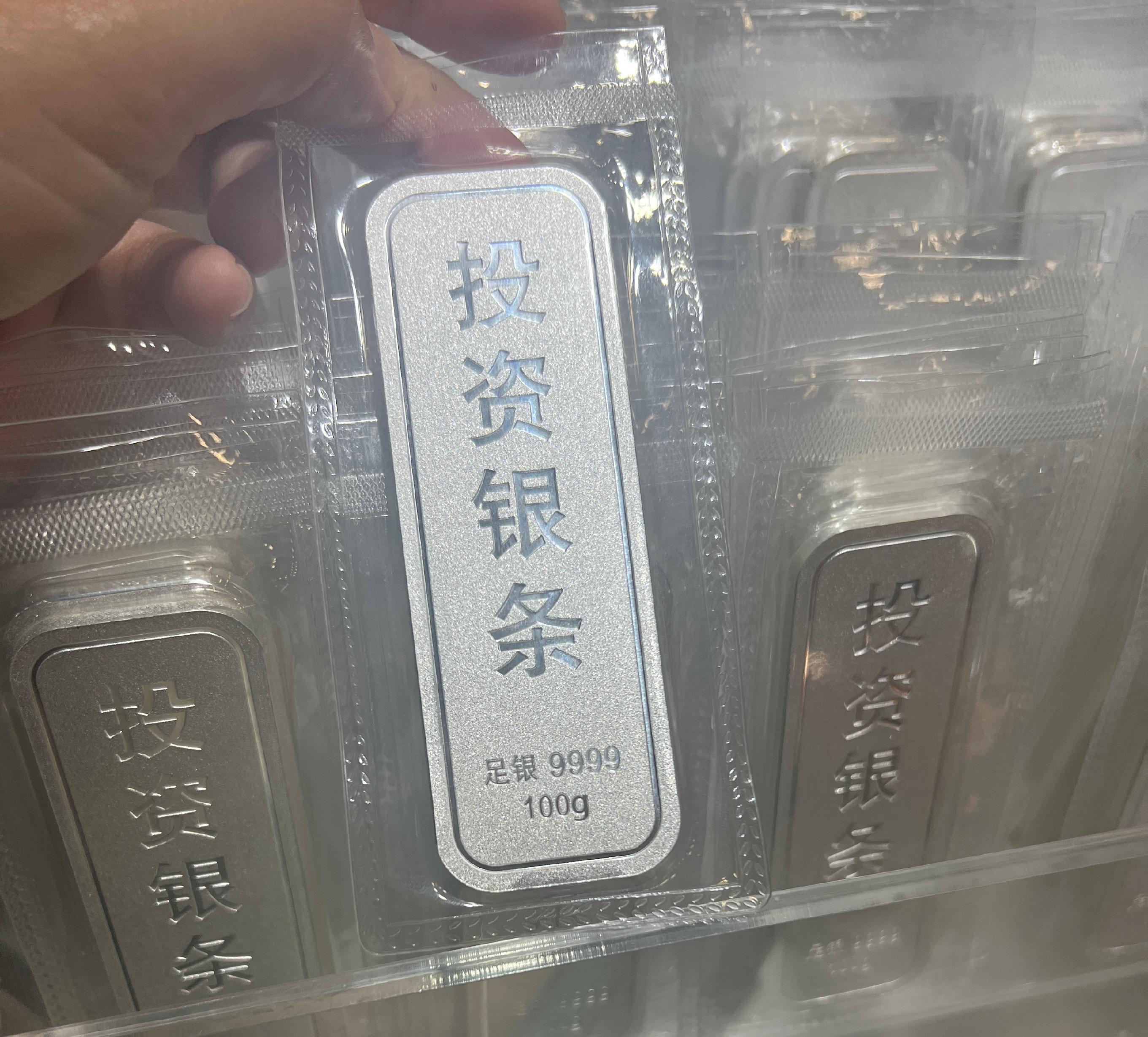 記者注意到,目前投資銀條的主流規格是1千克的銀條,此外還有15千克的銀板。商家告訴記者,越小規格的白銀,通常溢價也就越高。例如,1千克的銀條售價爲24.5元/克,但500克、200克、100克的銀條,售價可能會分別達到25元/克、27元/克、28元/克。其中原因則是,銀條規格越小,工費越高,如果是出於投資目的購買白銀,小規格銀條並不划算。
