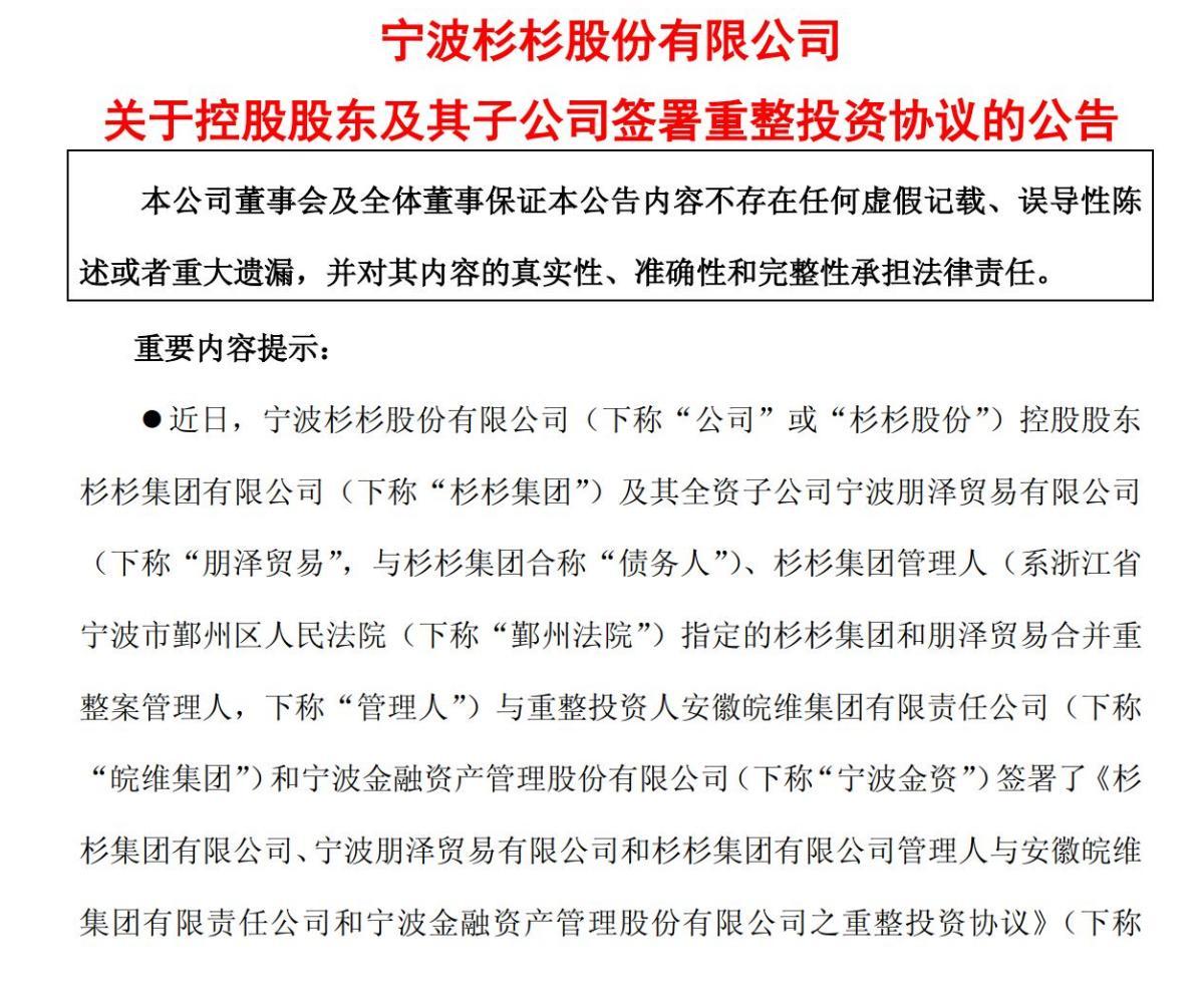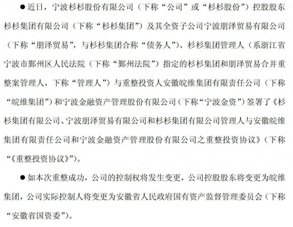 近期杉杉股份披露了重整進展,如果沒有意外,這家公司的實際控制人將變更爲安徽省國資委。