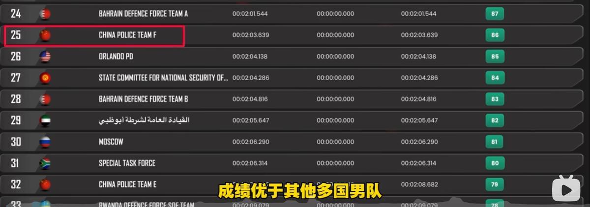 最後咱們再說回中國隊的表現,視頻中吊打印度的是來自公安部的特勤局女衛士長隊,可能是出場順序較早的緣故被博主直接拿來剪輯了,而另一隻晚些時候出場的四川女隊,最終完賽成績2分03秒,比特勤局隊還要快5秒,總排名高居25位,比大部分男隊強。對此咱只能說,中國女警,太強了。