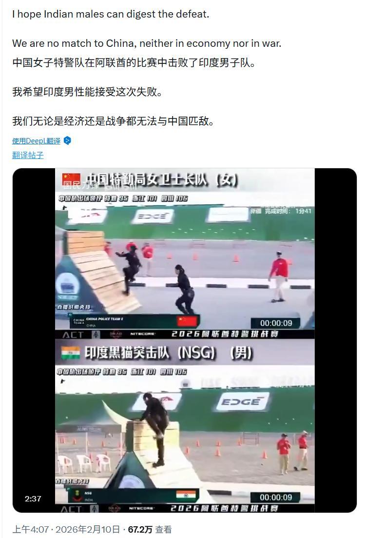 有網友把中國女隊的比賽視頻與印度頂級的黑貓突擊隊的放在一起對比,發現成績足足快了二十多秒,要知道,雙方的完成時間分別是2分08秒和2分31秒,這差距說吊打一點都不誇張吧。