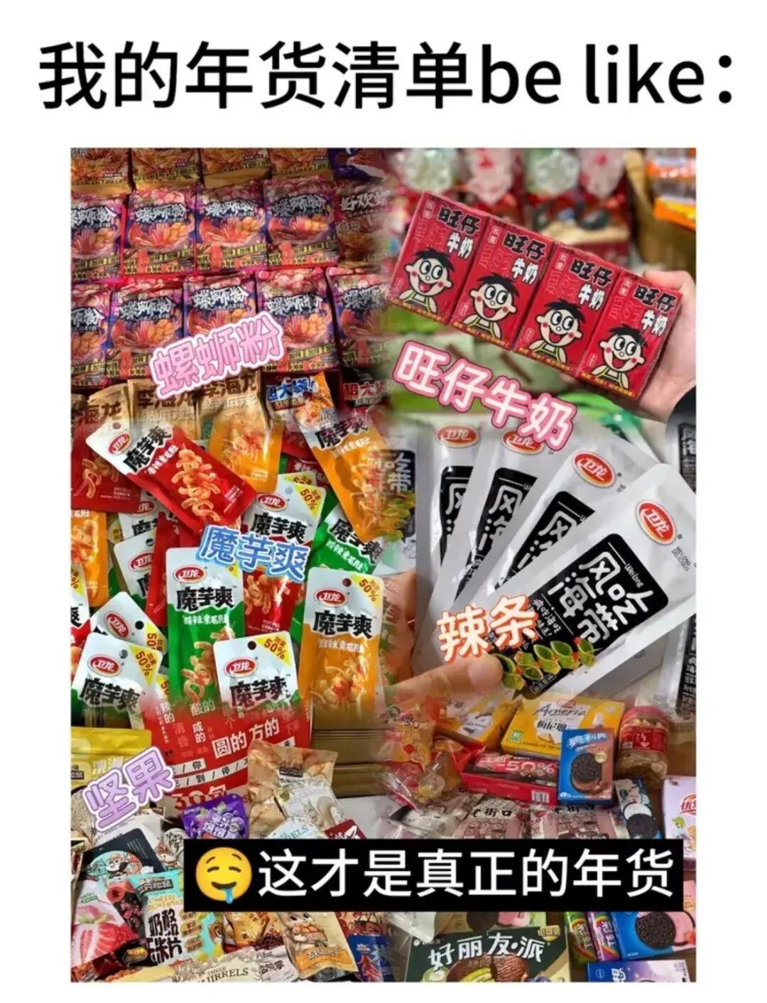 但00後的年貨,讓這種消沉的過年氛圍徹底支棱起來了。“畢竟當你手裏拿着的不是大集上買的花生瓜子,而是魔芋爽、滷味雞爪和蜜雪冰城時,再挑剔的年輕人也會被吊成翹嘴,在這種碳水和糖精的輪番轟炸下,悄然卸下所有的防備。”