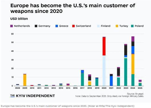 《基輔獨立報》報告顯示,2022至2024年,歐洲北約成員國裝備支出的51%流向了美國軍火商,例如F-35戰鬥機、“愛國者”導彈防禦系統……高於2019年至2021年的28%,對美軍事依賴絕非朝夕可破。