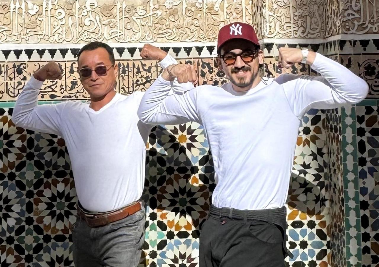於敏華(左)和外國朋友秀肌肉 傅建陳 攝