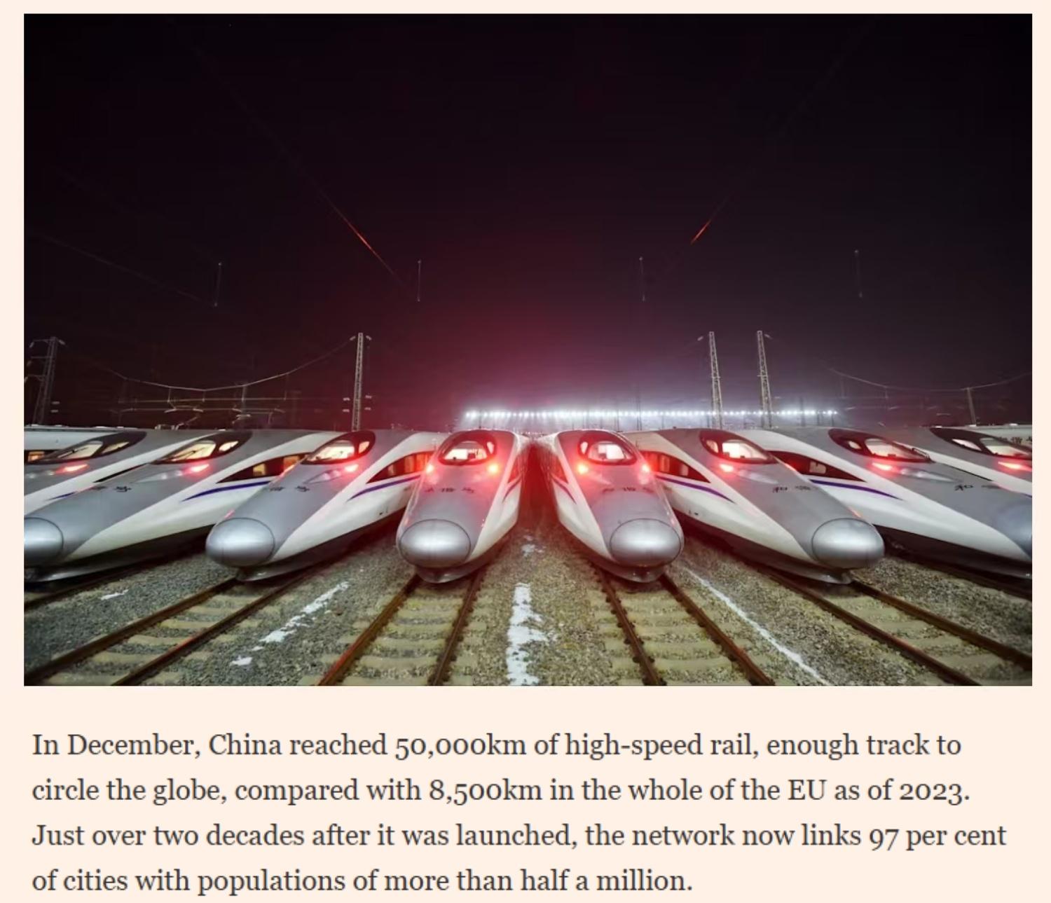 報道還關注到,2025年12月,中國高鐵運營里程突破5萬公里,足以繞地球一圈。相比之下,截至2023年,整個歐盟的高鐵里程爲8500公里。如今,中國高鐵網絡覆蓋了97%的50萬人口以上城市,而這項工程啓動至今不過二十餘年。