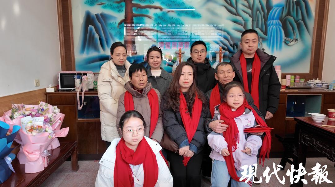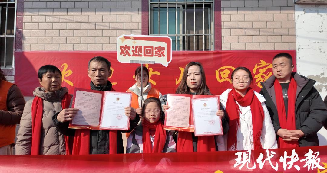 歸鄉當天,小院裏裏外外擠滿了鄉鄰,紅毯鋪地,桌上擺着寓意“長長久久”的麪條、“團團圓圓”的湯圓。“這是你大姐,這是二姐,你們姐妹三個,今天終於齊了!”在親人指引下,真真一一認親,姐妹們緊緊相擁,哭成淚人。