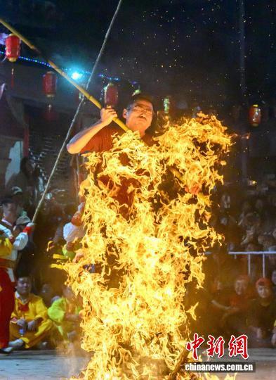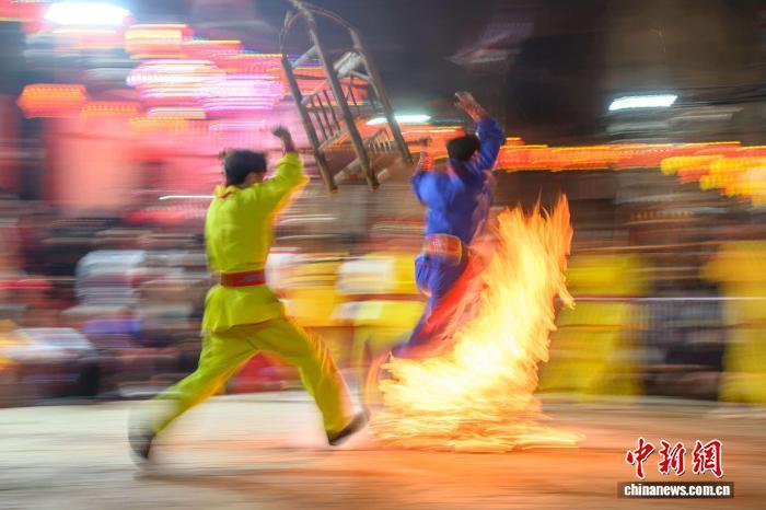 2月21日晚,福建省莆田市蒲坂村民衆舉行擺棕轎跳火鬧元宵活動。蒲坂村擺棕轎跳火鬧元宵傳承至今已有500多年曆史,火光吶喊聲中寄託着人們對新年的美好期盼。圖爲民衆擺棕轎跳火。中新社發 蔡昊 攝